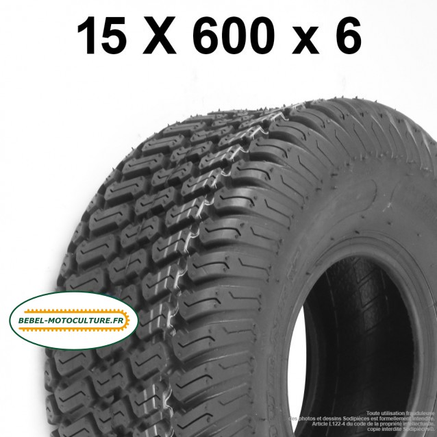 Pneumatique 6 pouces, profil gazon, 4 plis, taille 15×6.00-6 (15x600x6). Montage tubeless ou chambre à air.